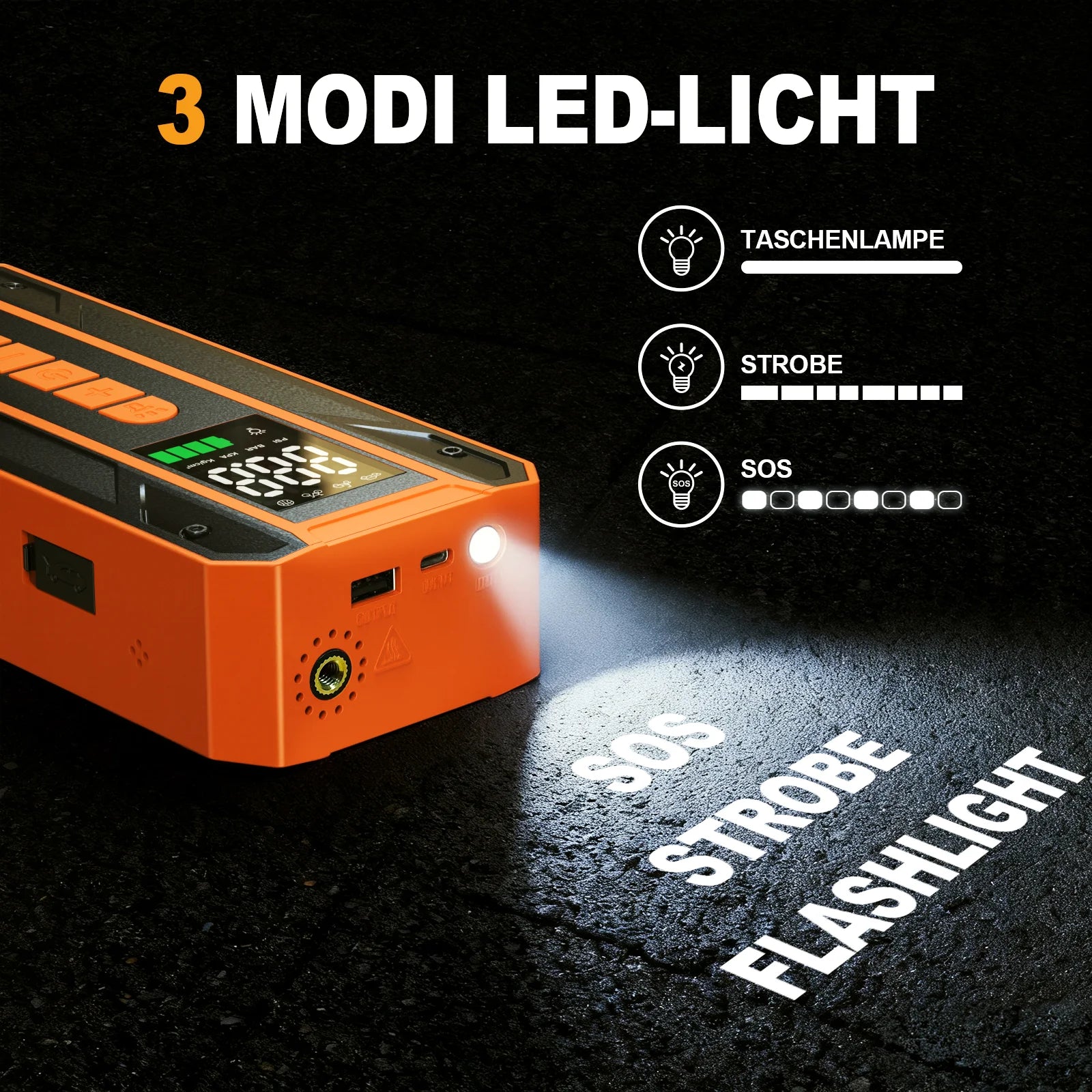 - 3000A peak jump starter delivers massive cranking power to start most vehicles quickly, even in extreme temperatures, with built-in protection for battery and electronics.