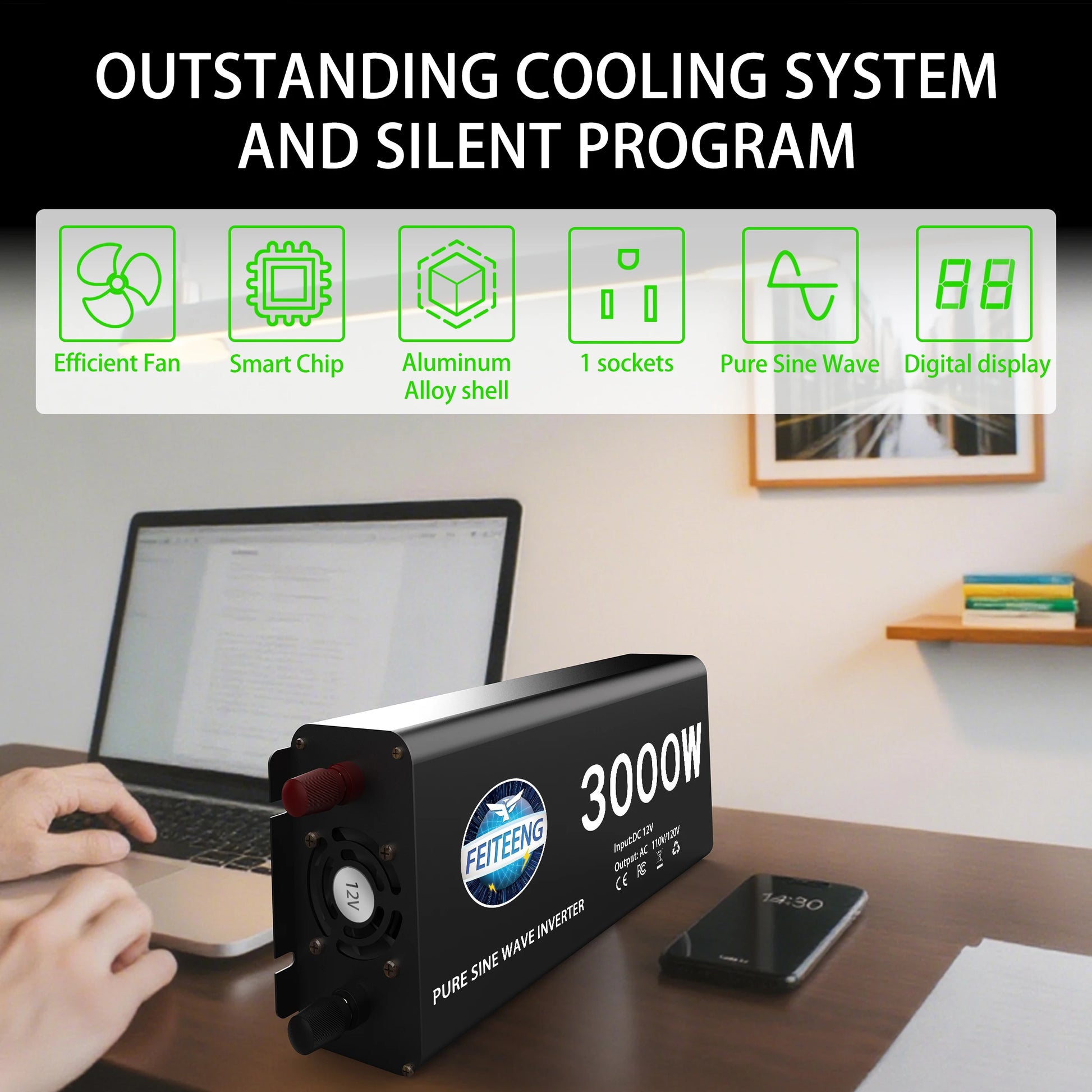 Intelligent temperature control: 45 ℃ fan automatically starts, 75 ℃ overheating protection