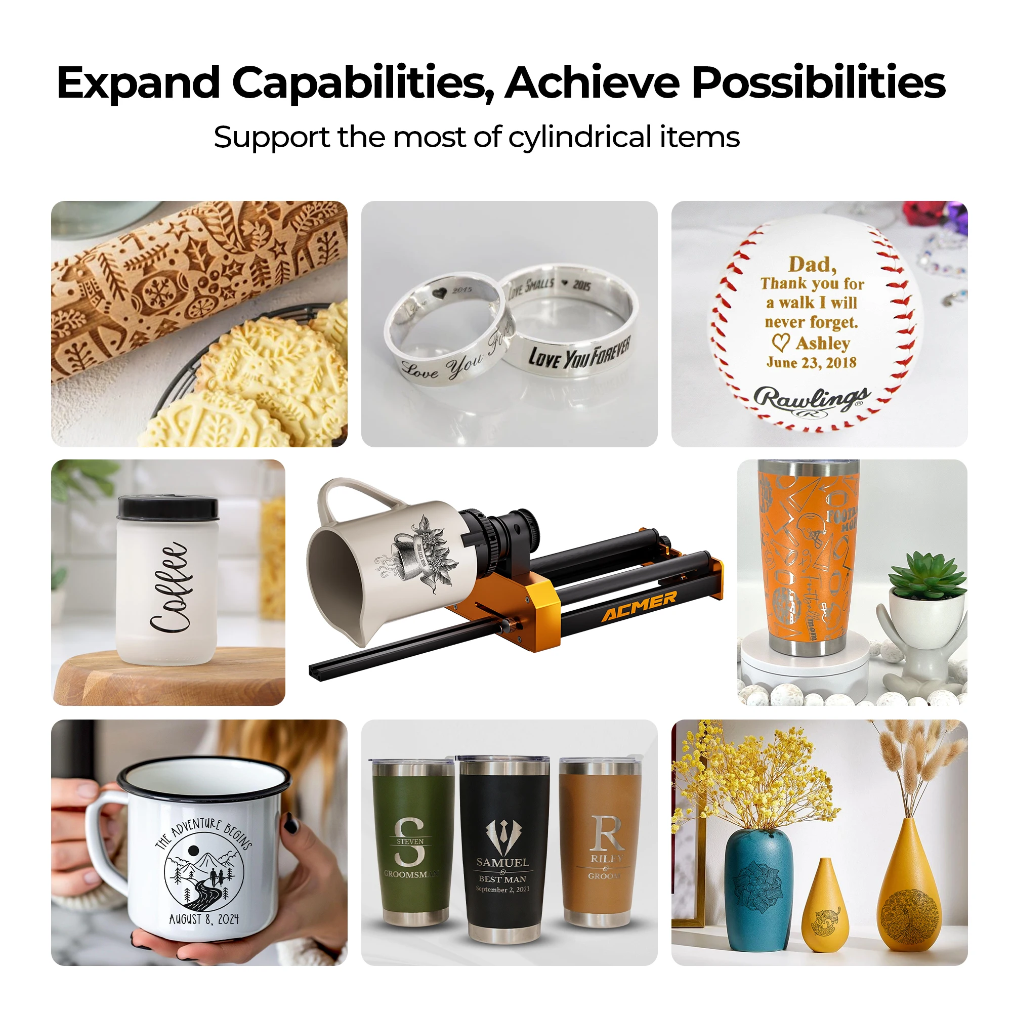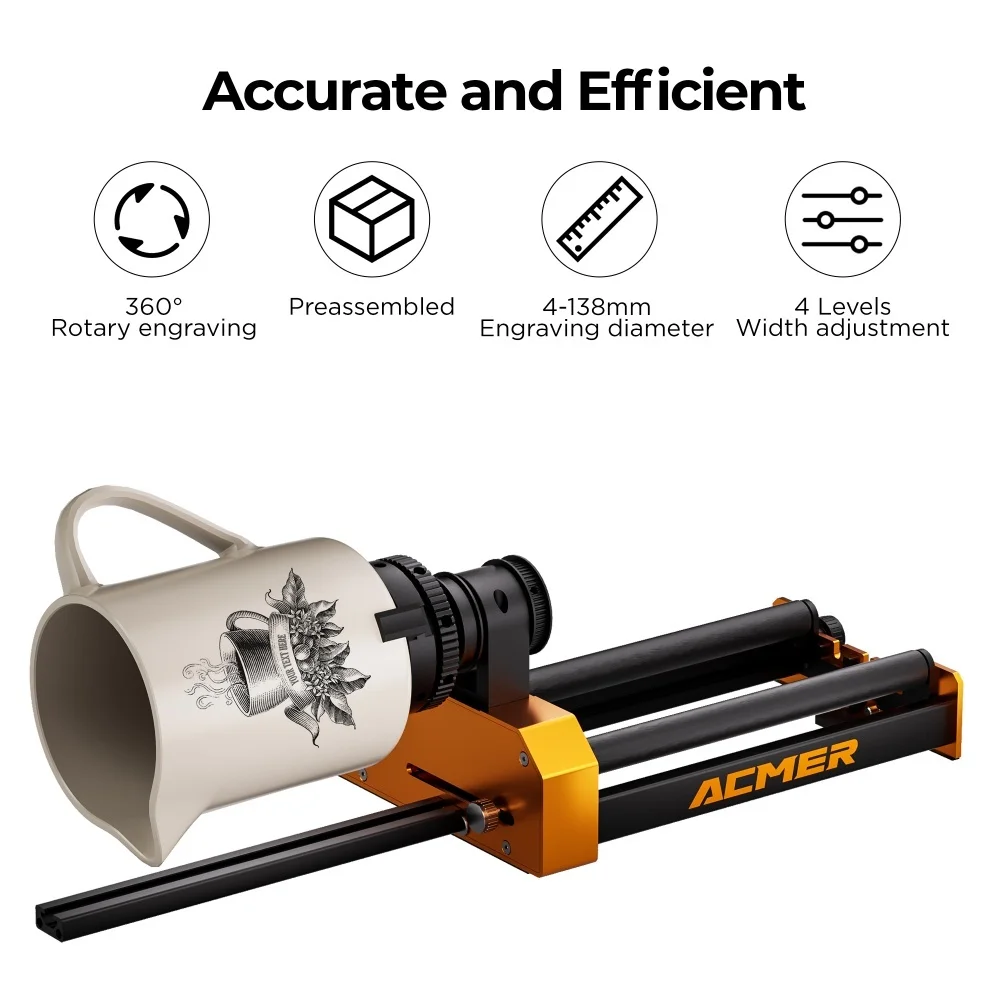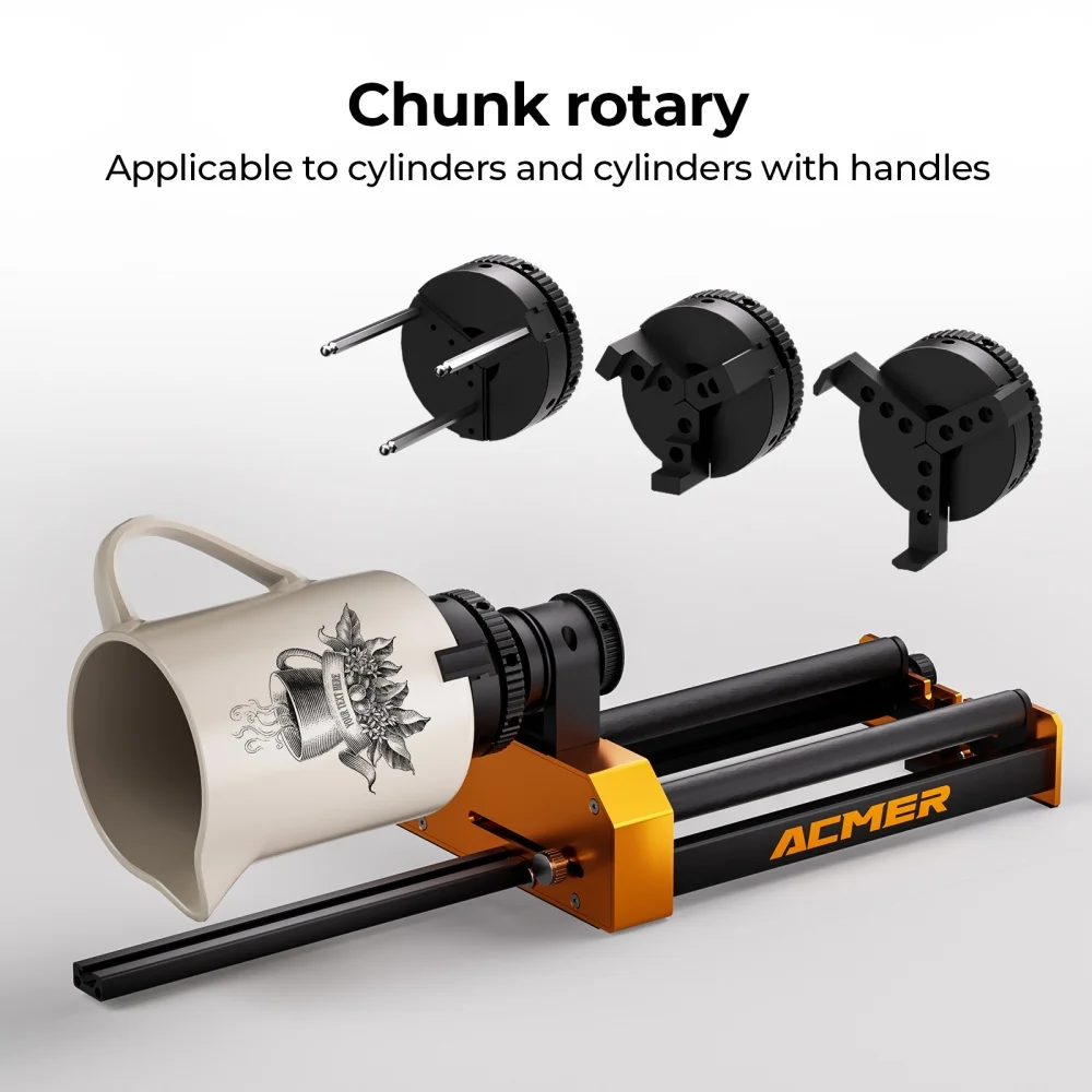 - ACMER 4-in-1 Laser Rotary Attachment - M4, including roller rotation, chuck rotation, sphere engraving module and ring engraving stud. You can unleash your creativity on almost any cylinder by replacing accessories such as wine glasses, snowman cups, baseball bats, rings, balls or cups with handles.