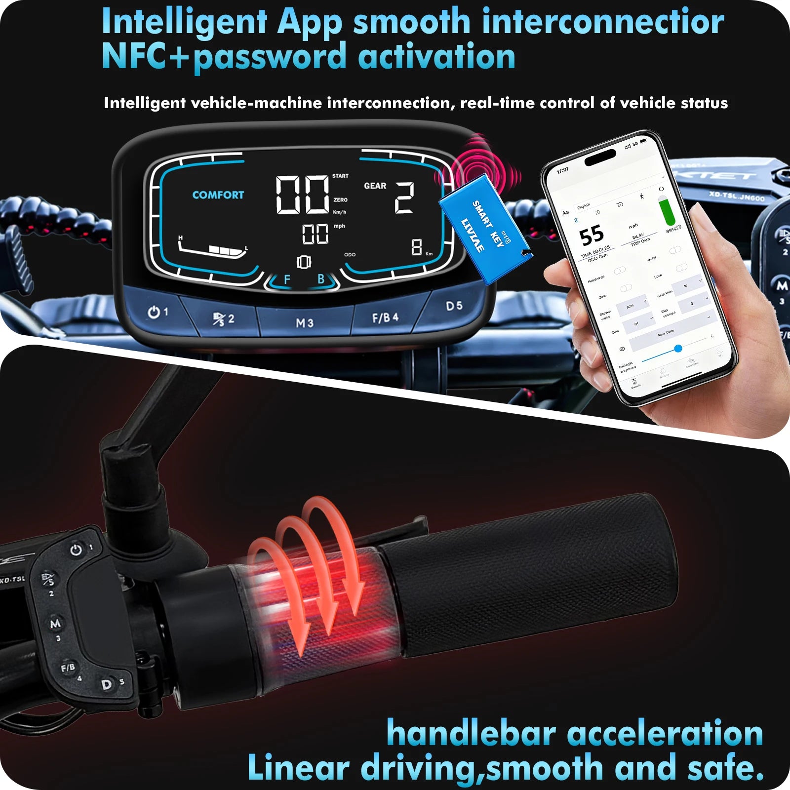 - Smart, secure controls: big display, smartphone app, NFC keyless start, and password protection keep ride data and settings at your fingertips.