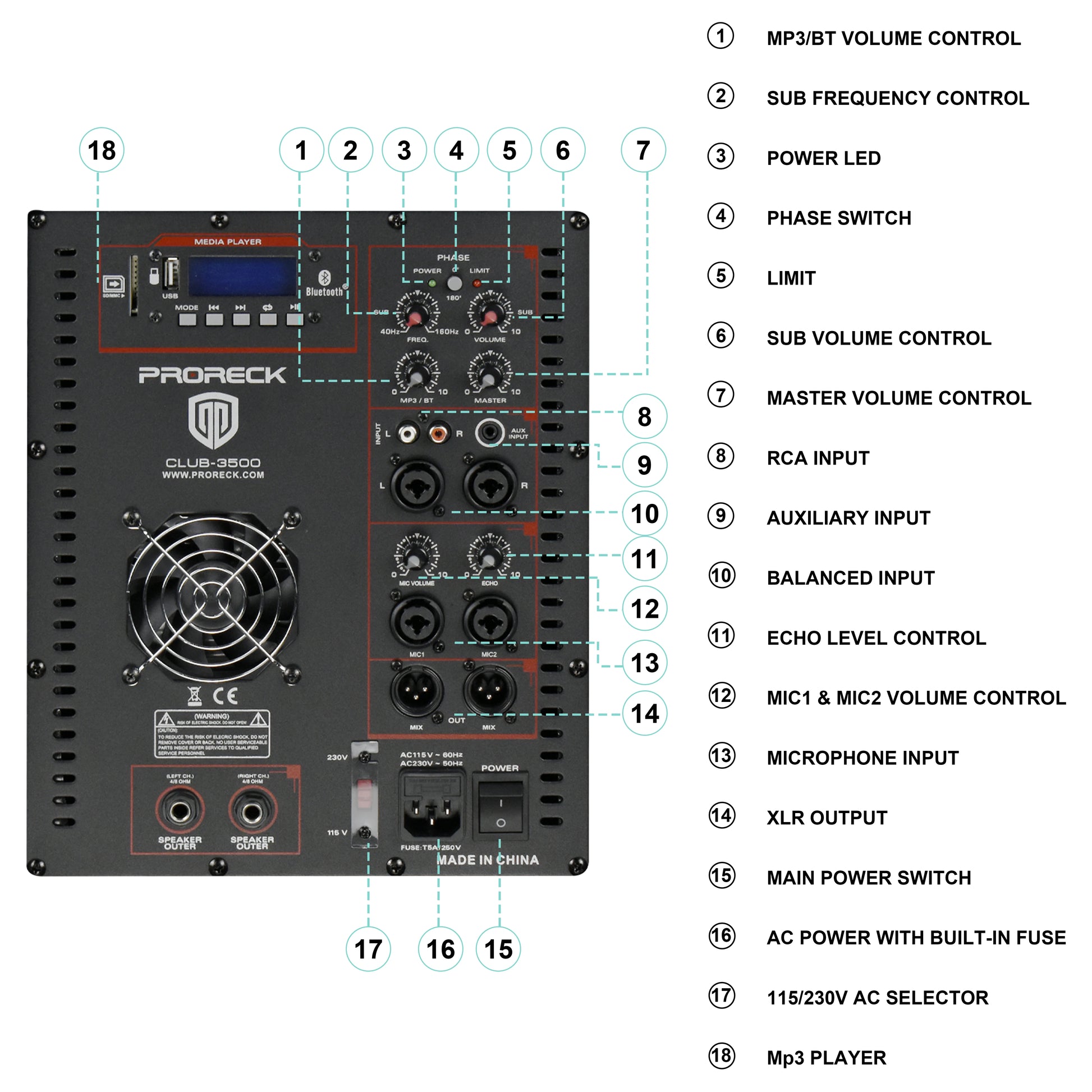 Turn any venue into a professional sound space with the PRORECK Club 3500 powered DJ PA system with Bluetooth.
