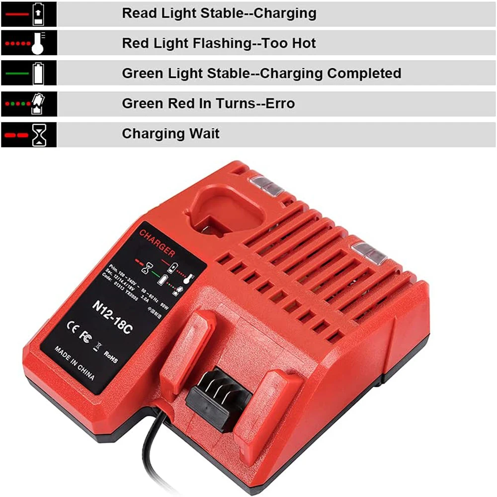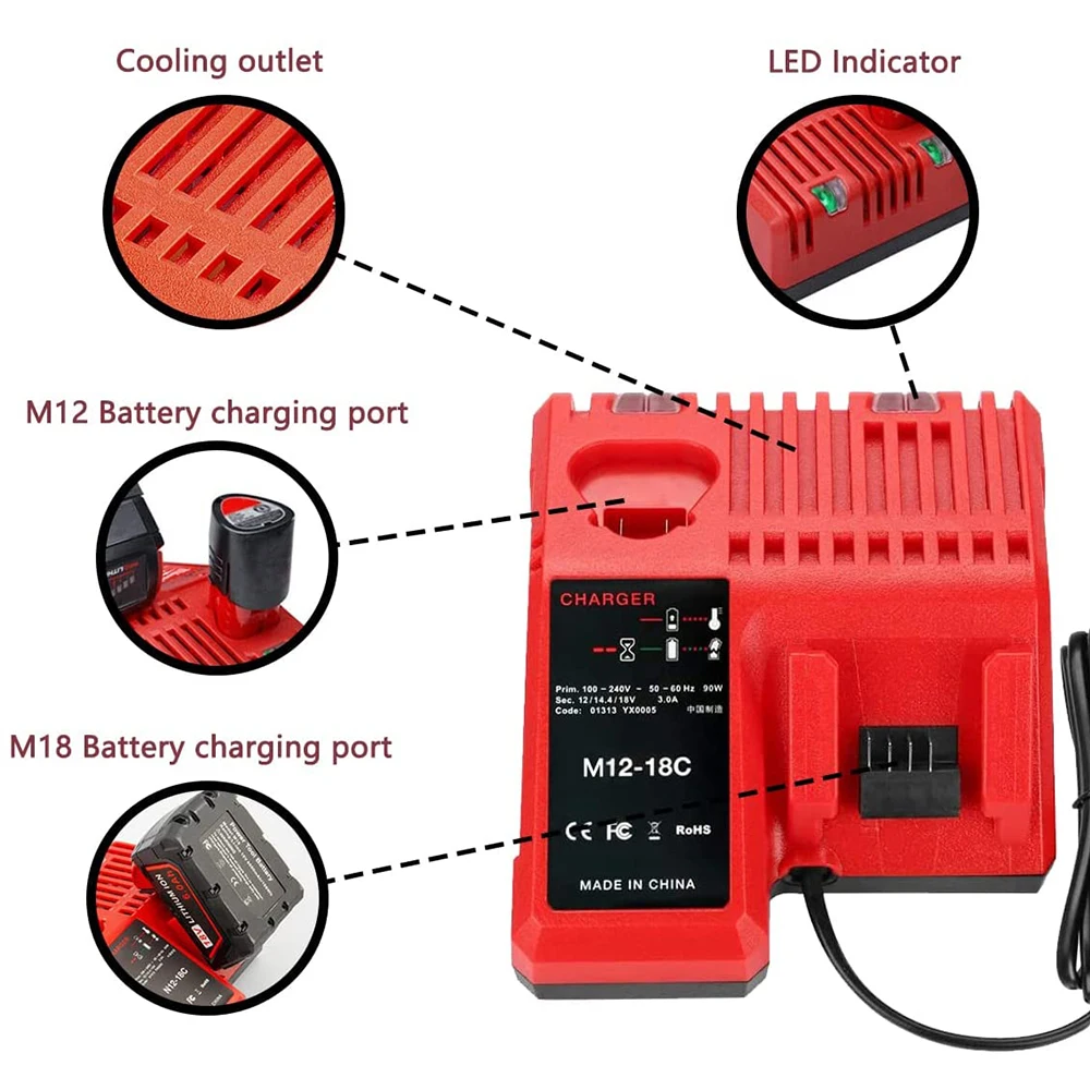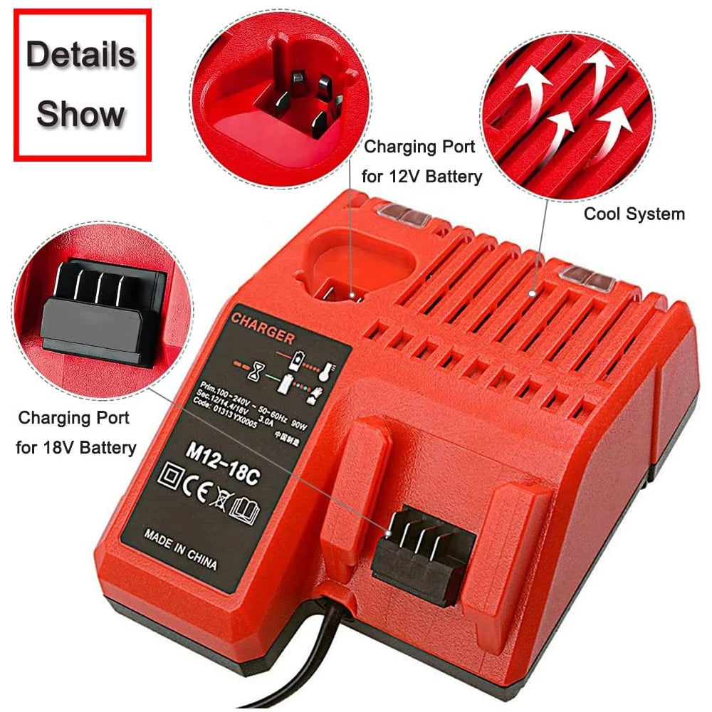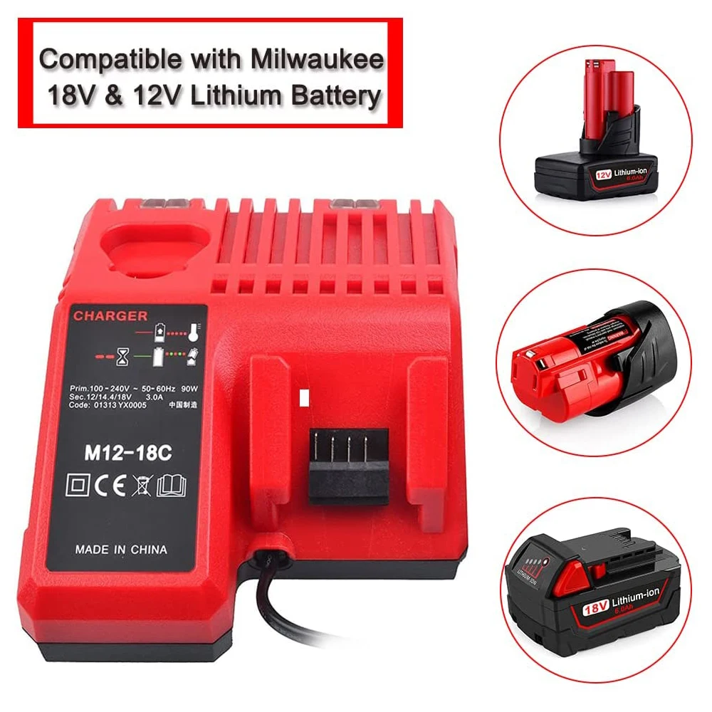 Charger Spcs: Model Number: M12-18C, Product Type: Milwaukee Battery Charger. Input: 100V-240V AC, 50-60 HZ, Output: 10.8V-18V DC, 3.0A DC, Voltage range: 90-264V AC. The temperature range that Charger operates: -20℃~40℃